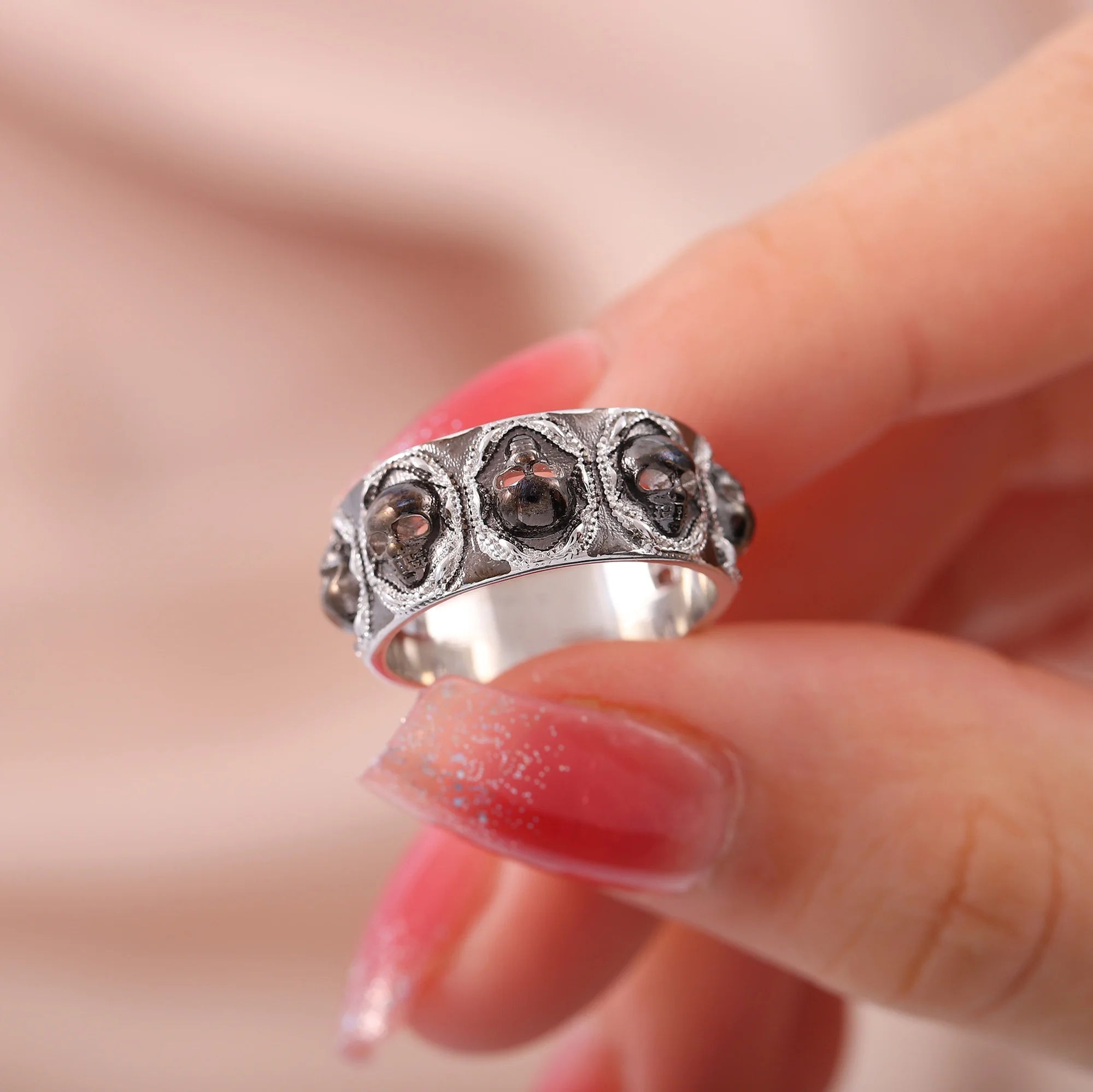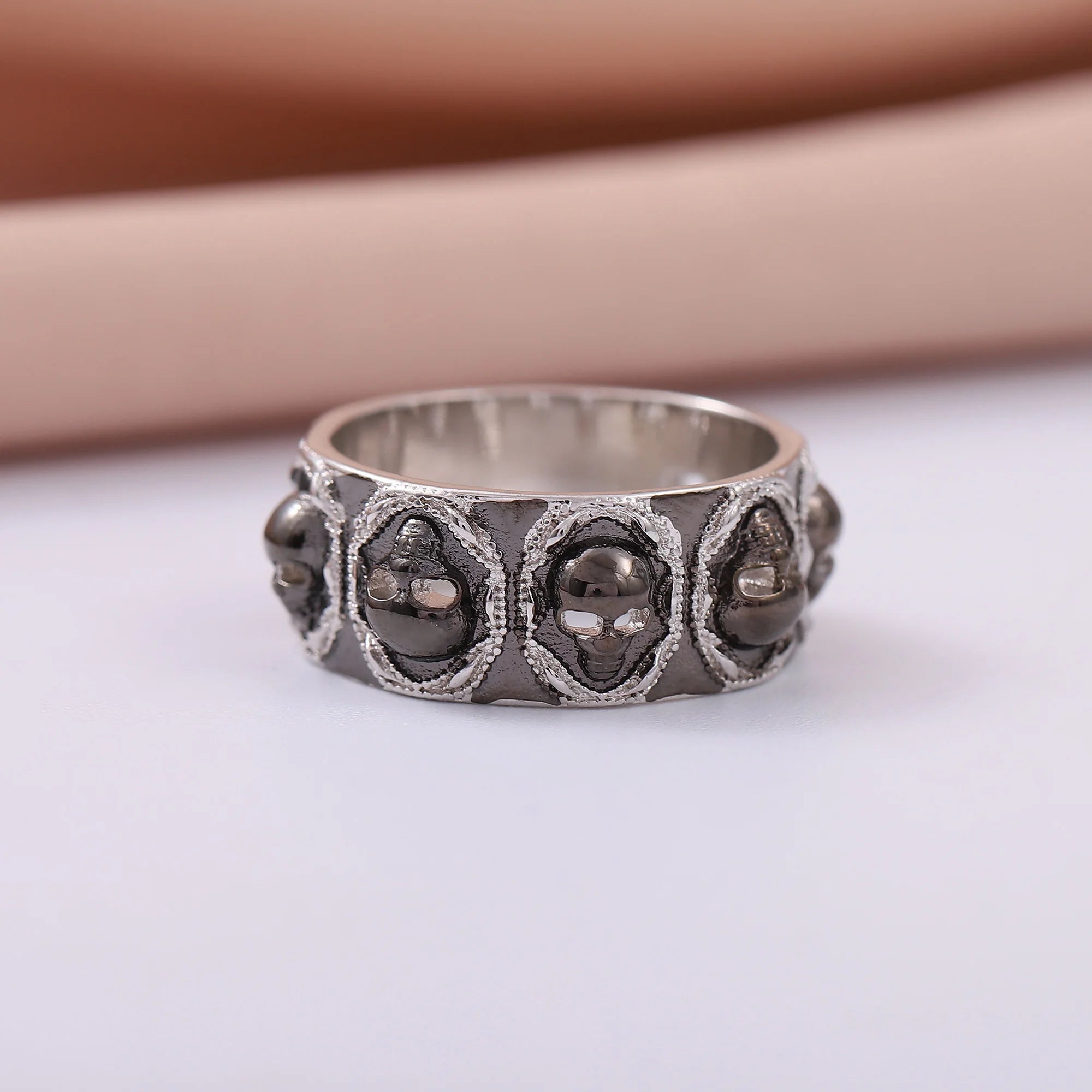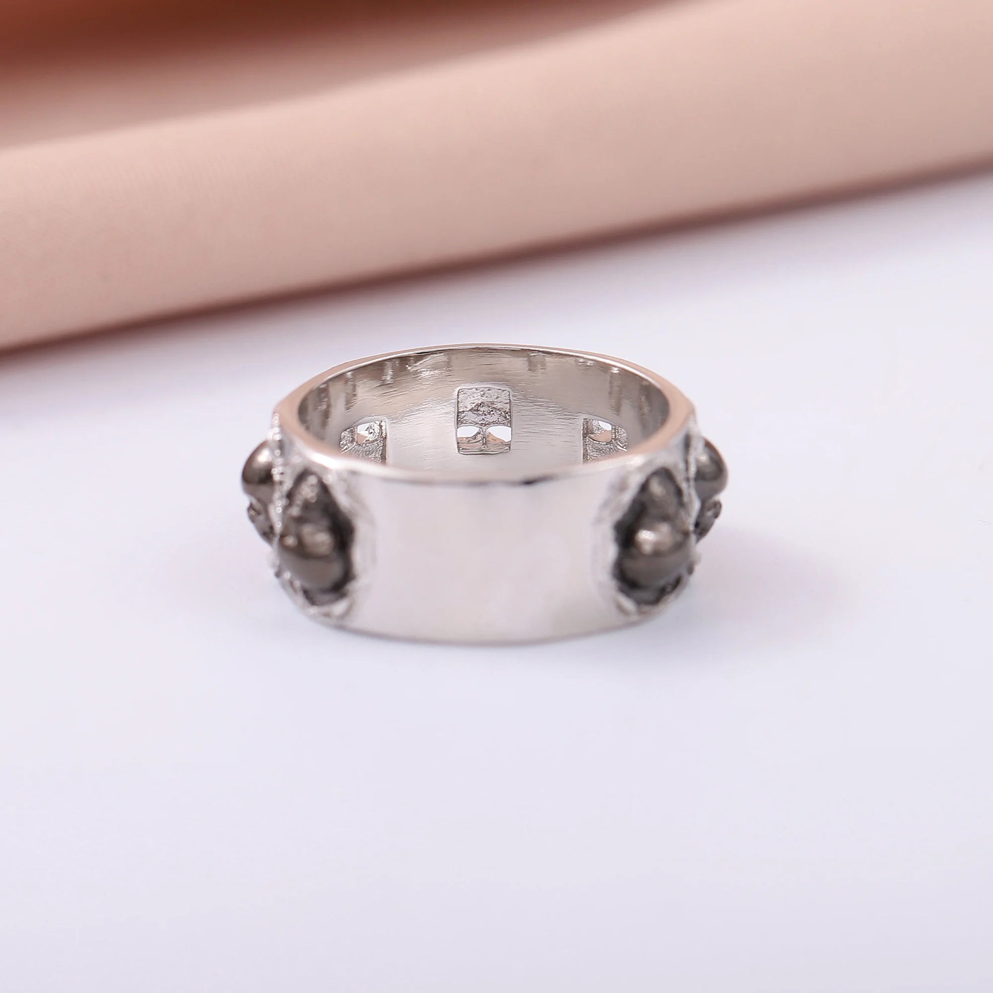 Que demander de plus ? Parfois il ne faut pas chercher bien loin pour faire une bague gothique tête de mort stylé. Avec ses cranes et sa couleur teintée de noir, cette bague rentre parfaitement et en toute simplicité dans l'univers gothique. Avec un de nos colliers gothique en plus de cette bague, votre style sera au complet.