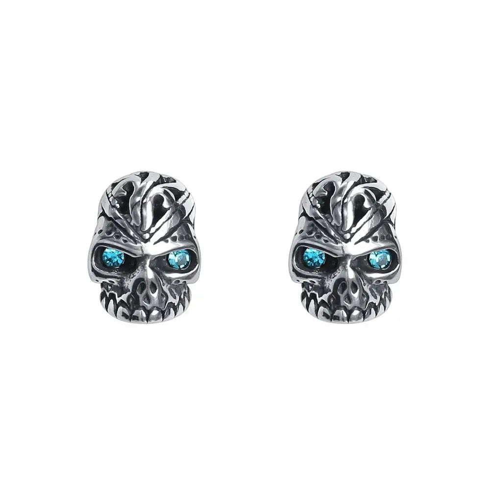 Wow ces boucles d'oreilles gothiques en acier inoxydable sont extra ! Ses petites têtes de morts argenté finition noircie et ses zircons bleus seront mettre en valeur votre style gothique. Associer à un de nos superbes colliers gothiques argent votre look seras 100% goth