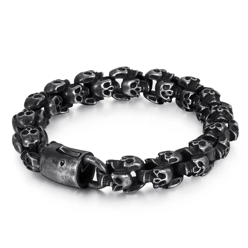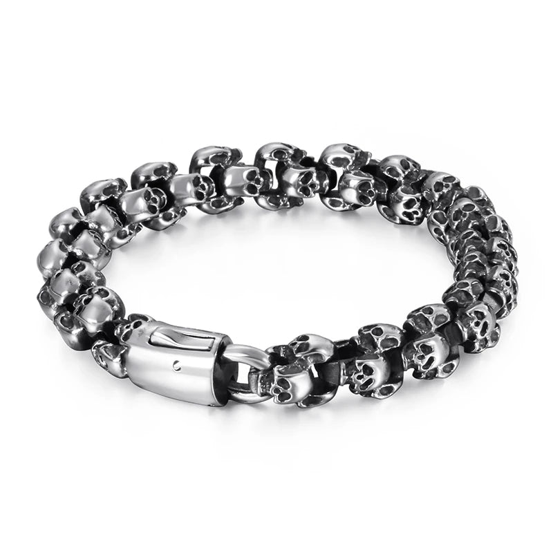 La mort jusqu'au bout des poignets. Avec ce bracelet gothique tête de mort, pas question de ne pas affirmer son côté dark, c'est bien l'inverse! Quatre différentes nuances de métal sont disponible pour s'accorder au mieux à vos envies, et à vos autres bijoux gothiques.