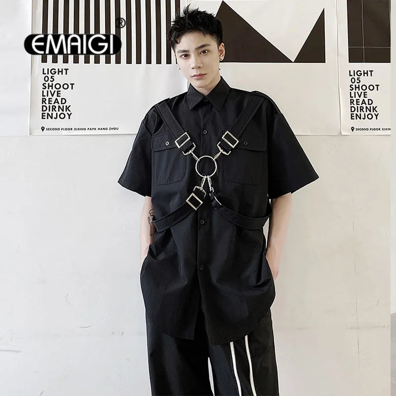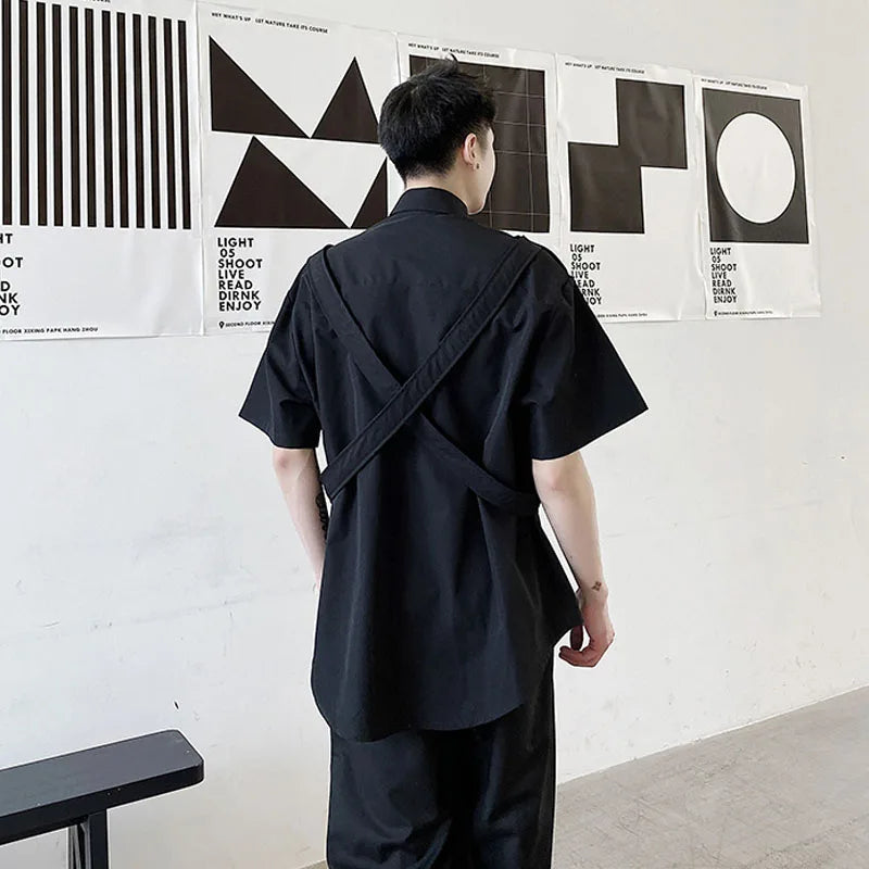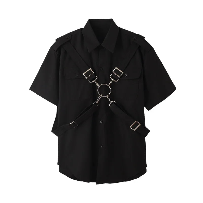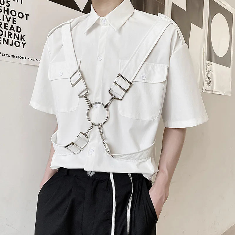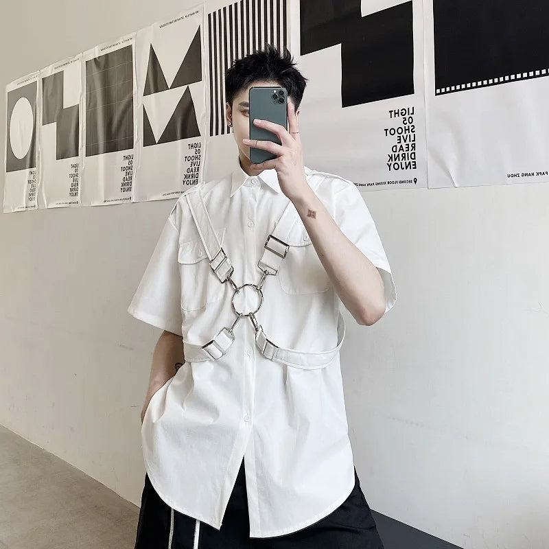 Bienvenue dans le futur ! En Corée, cette chemise gothique style kpop pour homme fait fureur et on comprend pourquoi. Ce modèle avec harnais est très rare en Europe, soyez unique !