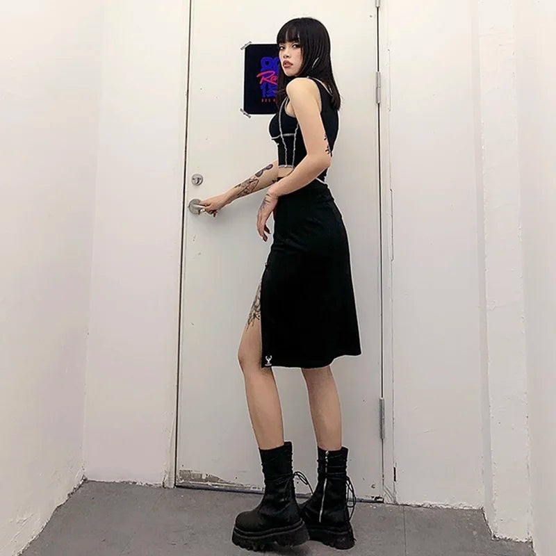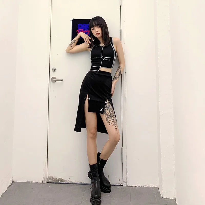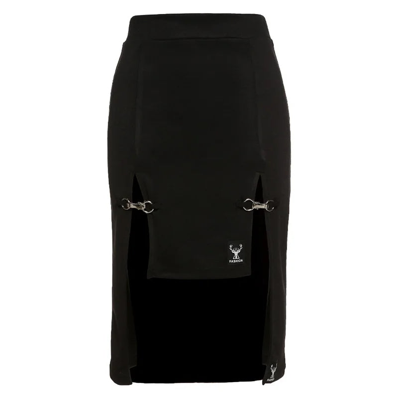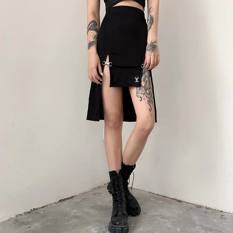 Cette jupe gothique femme noire ouverte sur les cuisses retenues par des anneaux est originale n’est ce pas ? Notre équipe de passionnées valide totalement ce style c'est pourquoi nous vous la proposons sur notre boutique. Sa coupe à 2 hauteurs et ses ouvertures sauront être sublimé par un de nos crop top gothique pour une tenue incroyable.