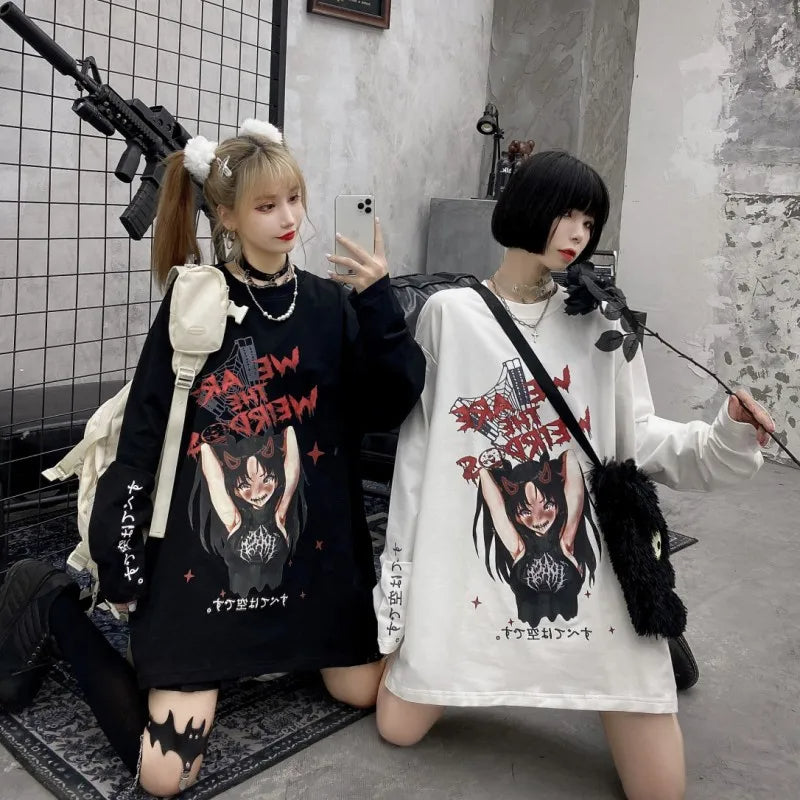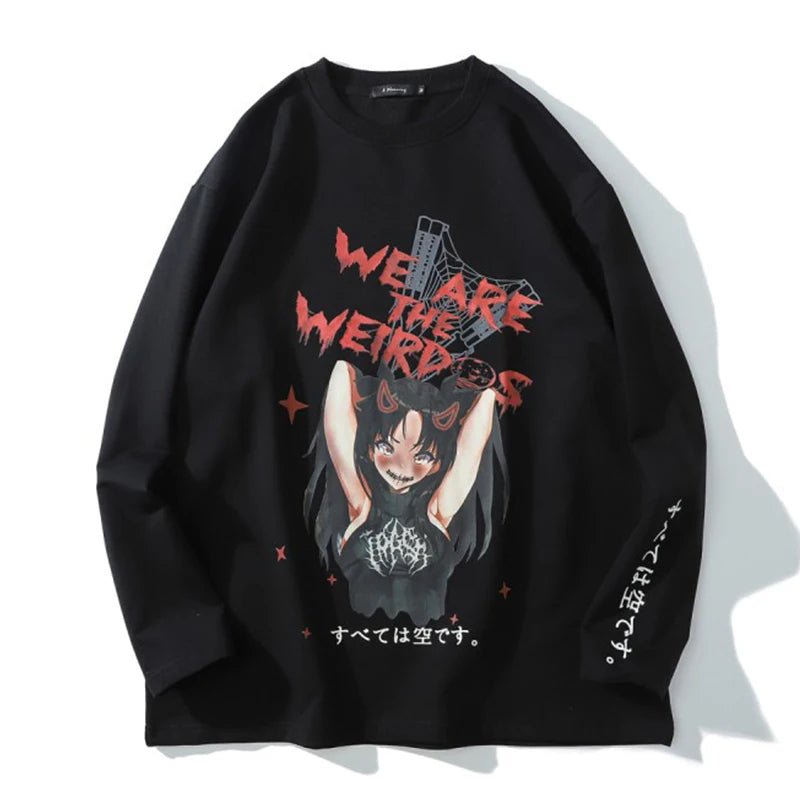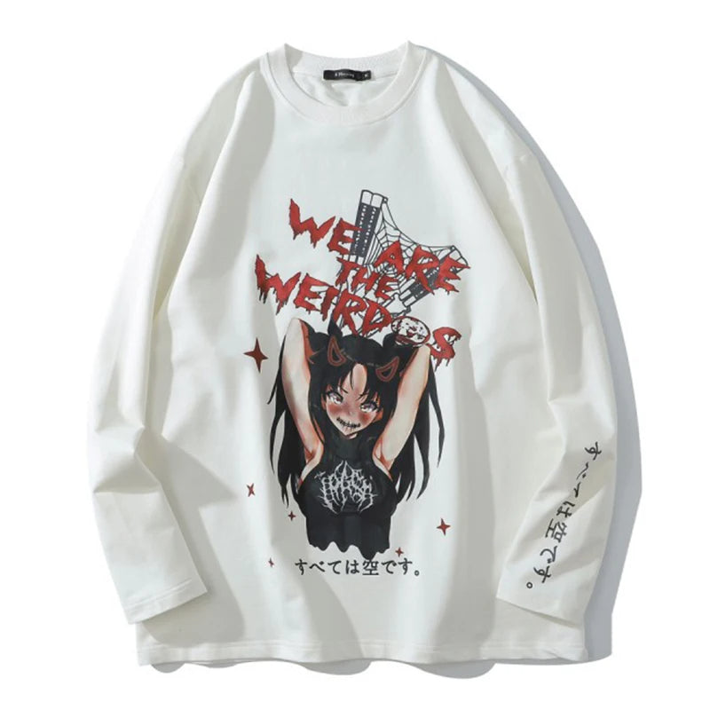 "We are the weirdos", ça nous va bien au final non ? Que ce soit en blanc ou en noir, ce pull gothique homme avec son imprimé diablesse style manga saura vous accompagner au quotidien. A porter par dessus nos Tee shirt gothique.