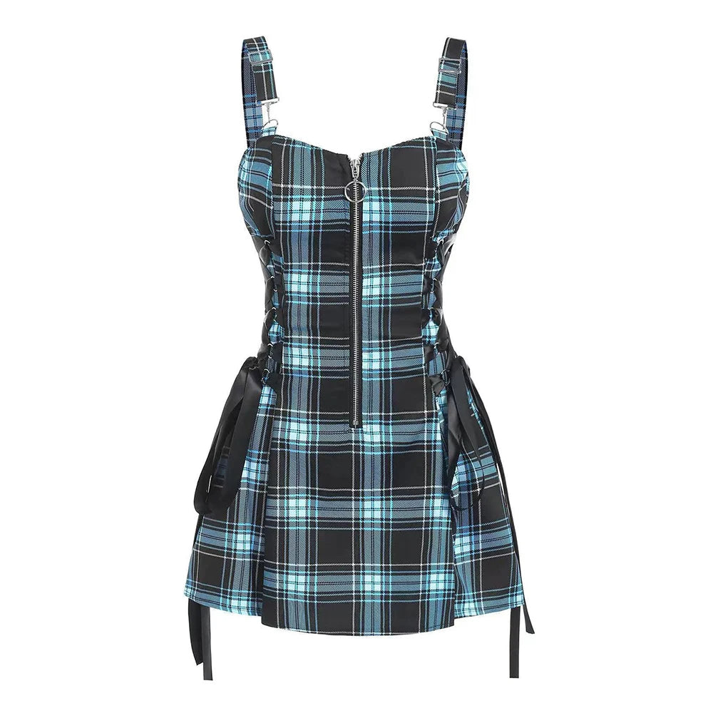 Une robe gothique au motif plaids bleu parfait pour assumer un style e-girl associer avec une de nos paire de bas résille disponible sur notre boutique en ligne.