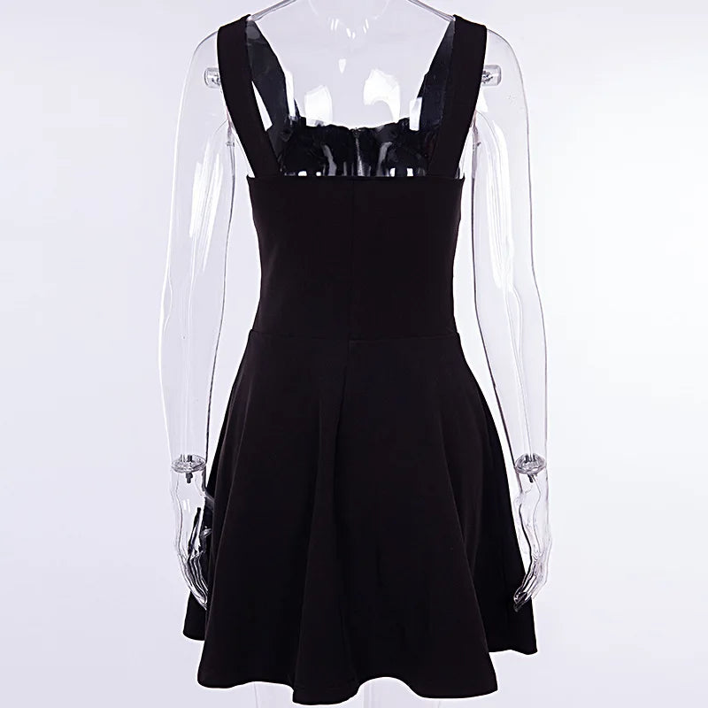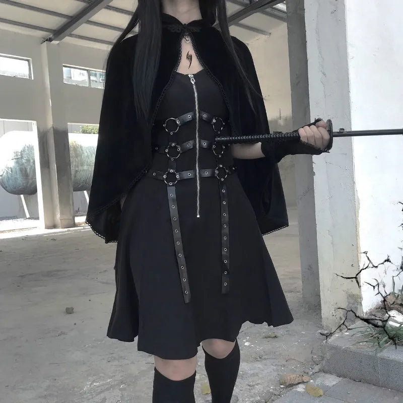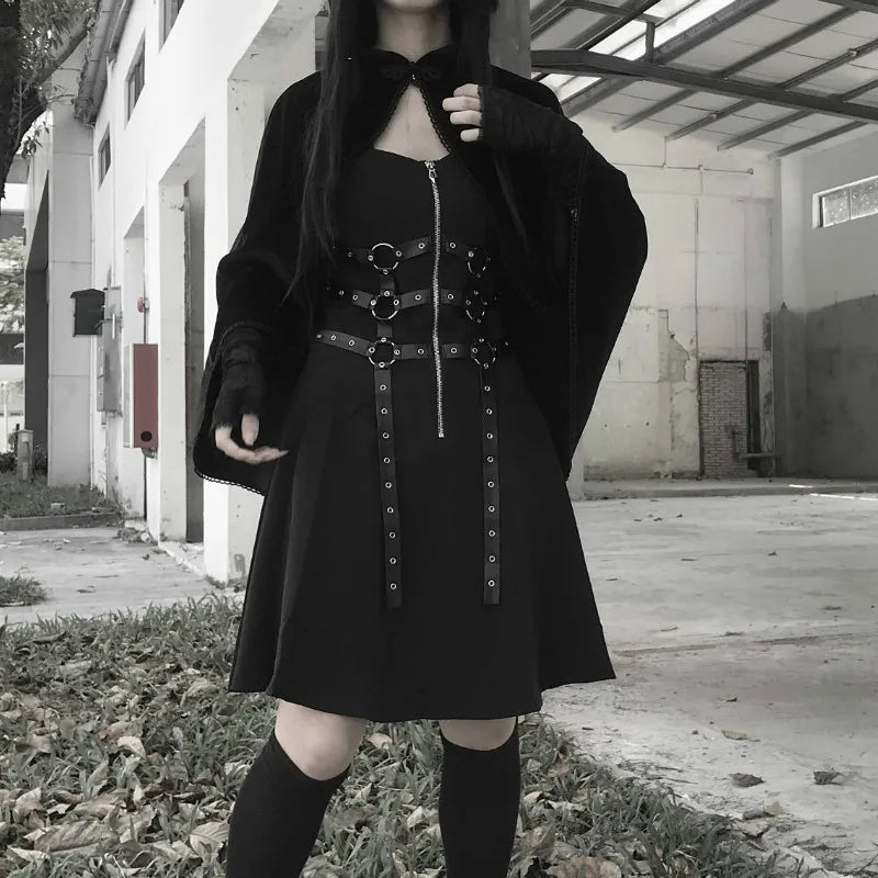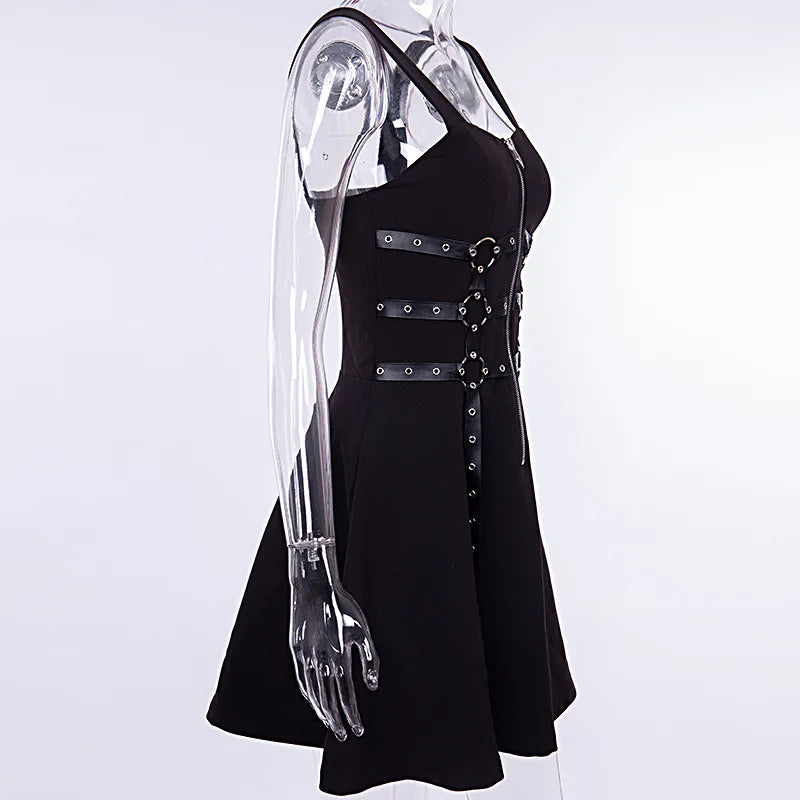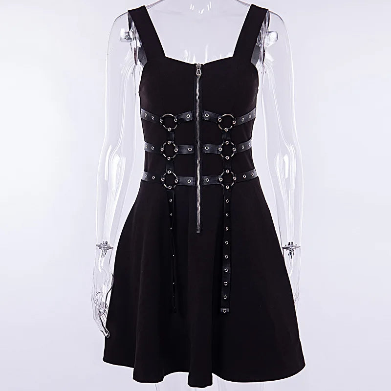 Avec sa coupe fit and flare, ses lanières style cuir cloutées comme un biker et sa fermeture zippé sur la poitrine, tous les codes gothiques sont repris dans cette robe gothique courte de la façon la plus incontournable. Portez la avec des bas résilles au quotidien pour un style des plus détonnant. En tout cas, notre équipe l'adore, attention à ce qu'on ne finisse pas le stock nous même ;)