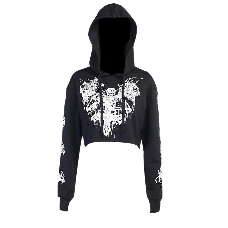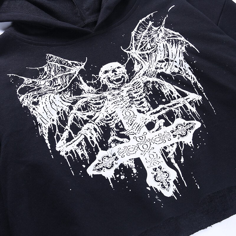 Ce qui est sûr c'est que ce top est vraiment très anticonformiste avec son imprimé squelette et sa croix satanique, ce sweat gothique crop top pour femme saura trouver sa place dans une de vos tenues style punk gothique. Ce sweat shirt sera parfait avec un de nos legging goth pour un look à contre courant en toute simplicité.