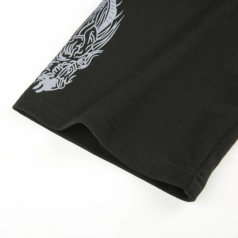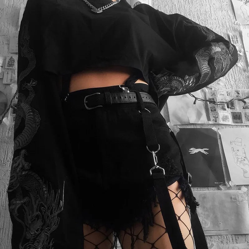 Un look sexy avec un sweat gothique femme imprimé dragon, en avez vous déjà dans votre garde robe ? Si ce n'est pas le cas, notre équipe de choc vous propose en exclu totale ce sweat avec sa coupe crop top et ses imprimés dragons aux inspirations asiatiques sur les manches. Ses petites bretelles ajoutent une grande originalité en toute simplicité. Portez le avec un pantalon en toile noir dans vos créations tik tok et faites péter les likes !